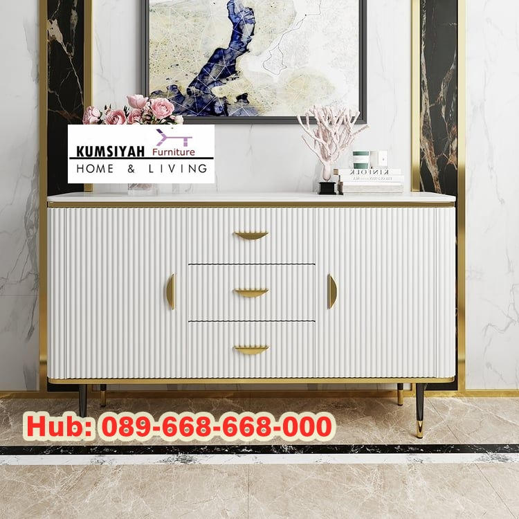 Buffet Credenza merupakan furnitur setengah lemari atau berupa lemari penyimpanan dan meja yang bentuknya sama seperti meja konsol dengan banyak fungsi sebagai tempat penyimpanan. Istilah credenza berasal dari bahasa Italia yang berarti kepercayaan atau keyakinan. Desain salur pada Buffet Minimalis Stainless Modern kali ini memberikan kesan yang lebih modern memberikan sentuhan artistik yang unik dan elegan. Warna putih membuat tampilan menjadi bersih, cerah, dan modern. Cocok ditempatkan di berbagai area seperti ruang tamu, ruang keluarga, atau ruang makan untuk menyimpan peralatan makan, dekorasi, atau barang lainnya.