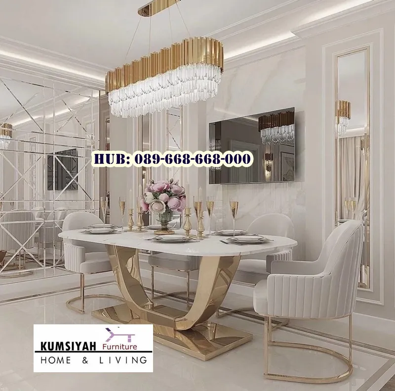 Meja makan dengan motif marmer adalah pilihan yang bagus jika Anda ingin membuat ruang makan terlihat lebih mewah dan elegan. Penampilannya mirip dengan marmer sungguhan, memberikan kesan modern, bersih, dan berkelas sekaligus tetap fungsional sebagai tempat berkumpul keluarga. Desain marmer yang menarik pada permukaan meja membuatnya terlihat alami dan menarik, cocok untuk dipadukan dengan berbagai gaya interior, seperti minimalis, klasik, atau kontemporer.