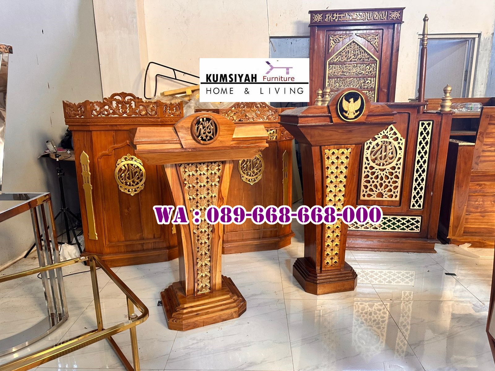 Cianjur terletak di Provinsi Jawa Barat. Cianjur memiliki potensi pertanian yang kaya, terutama beras Pandanwangi, sektor pariwisata yang berkembang, serta seni bela diri pencak silat yang terkenal. Diberbagai masjid daerah cianjur pasti memerlukan podium masjid untuk mempermudah imam saat ceramah dan menjadi pelengkap dalam interior masjid. Kali ini kami akan menawarkan Podium Masjid Cianjur yang terbuat dari bahan kayu jati yang berkualitas tinggi. Kayu jati yang memiliki kelebihan dalam hal kekuatan, keawetan, dan daya tahan terhadap rayap. Kayu jati memiliki serat yang indah dan warna yang menarik, sehingga podium yang terbuat dari kayu jati akan menambah keindahan masjid. Kandungan minyak alami dalam kayu jati membuatnya lebih awet dan tahan lama, membuat podium tidak mudah rusak atau lapuk. Podium ini juga dilengkapi ukiran dan kaligrafi yang indah sehingga terlihat islami dan menarik. Pilih Podium Masjid Cianjur untuk melengkapi masjid Anda agar lebih terlihat indah dan mewah.